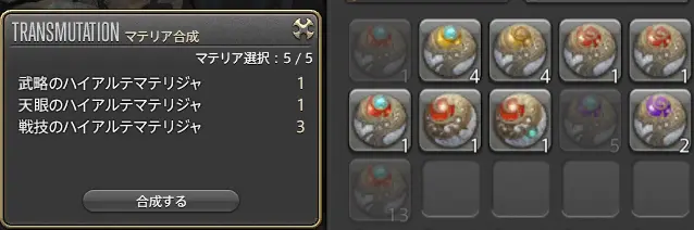 「合成するマテリアを選んでください」というウィンドウが出たら手持ちのマテリアを1つずつ選びます。同じ種類でも問題ありません。