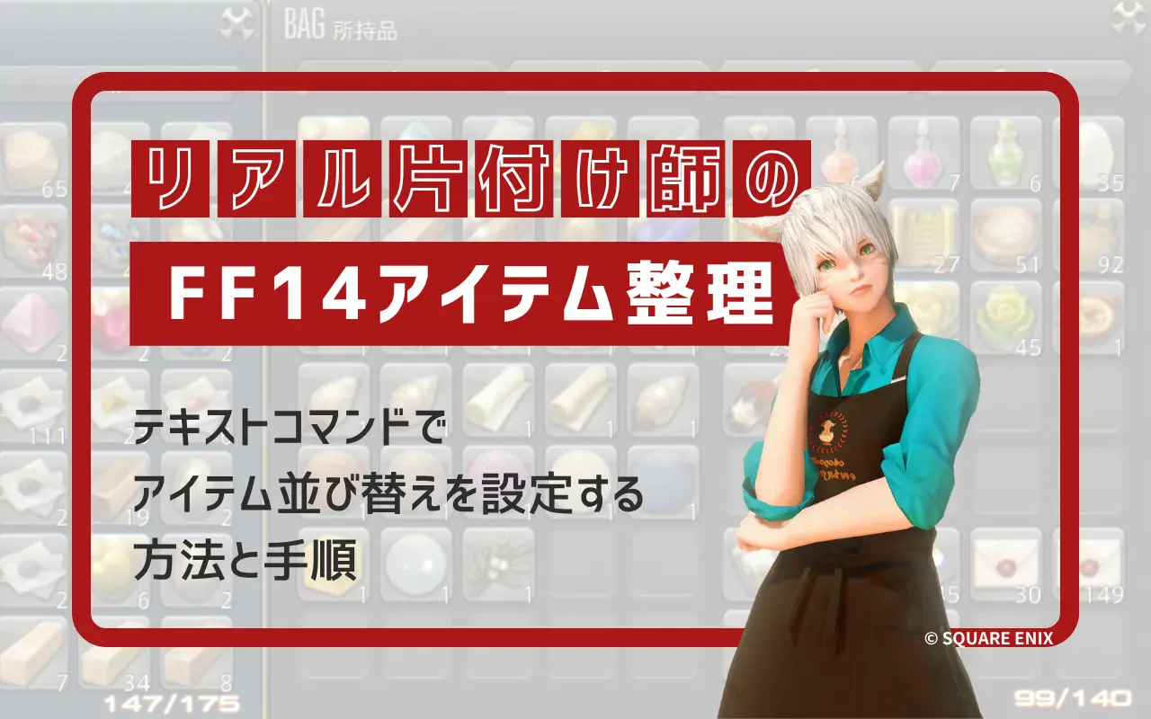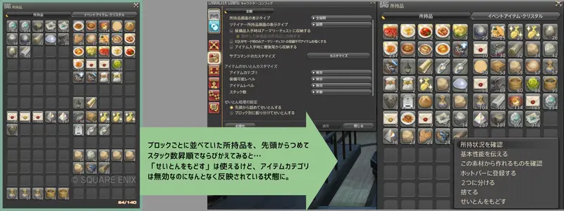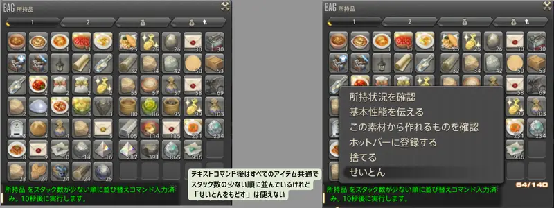 ただし、チョコボかばんとリテイナーの所持品については、それぞれアイテム整理したい対象のインベントリを開いているときだけコマンドが実行できます。閉じた状態では動作しないので注意してください。